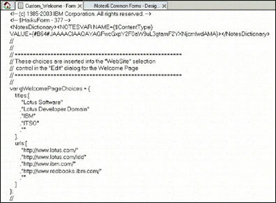 ¥i¥H¦Û­q¦W¬° Custom_WelcomePage ªº®Mªí¡A¼W¥[§ó¦hªº¦b Welcome ­¶­±°t¸mªº Edit ¹ï¸Ü¤è¶ô¤º¶i¦æ Web ¯¸ÂI¿ï¾Ü±±¨îªº¾÷·|¡C¤U­±ªº¿Ã¹õÅã¥Ü¤F­n¦b Domino Designer ¤¤¶i¦æ½s¿èªº¤w¥´¶}ªº Custom_WelcomePage¡G