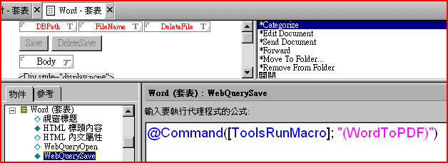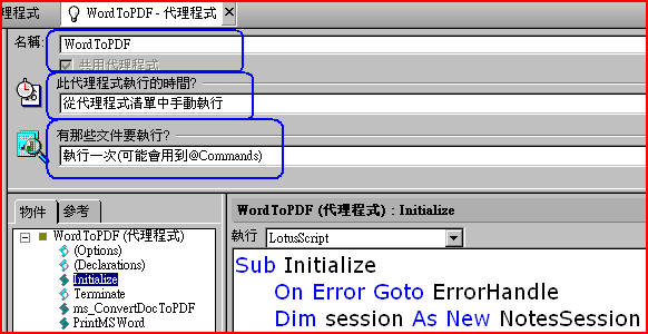 本期電子報將介紹如何利用Notes Script程式將Word檔案轉換成PDF檔案,此範例仍需搭配Acrobat Writer的軟體,且本程式範例並非提供為節省Acrobat Writer License使用,故如欲使用本程式來轉換PDF檔案的話,仍須購買足夠數量之Acrobat Writer軟體。